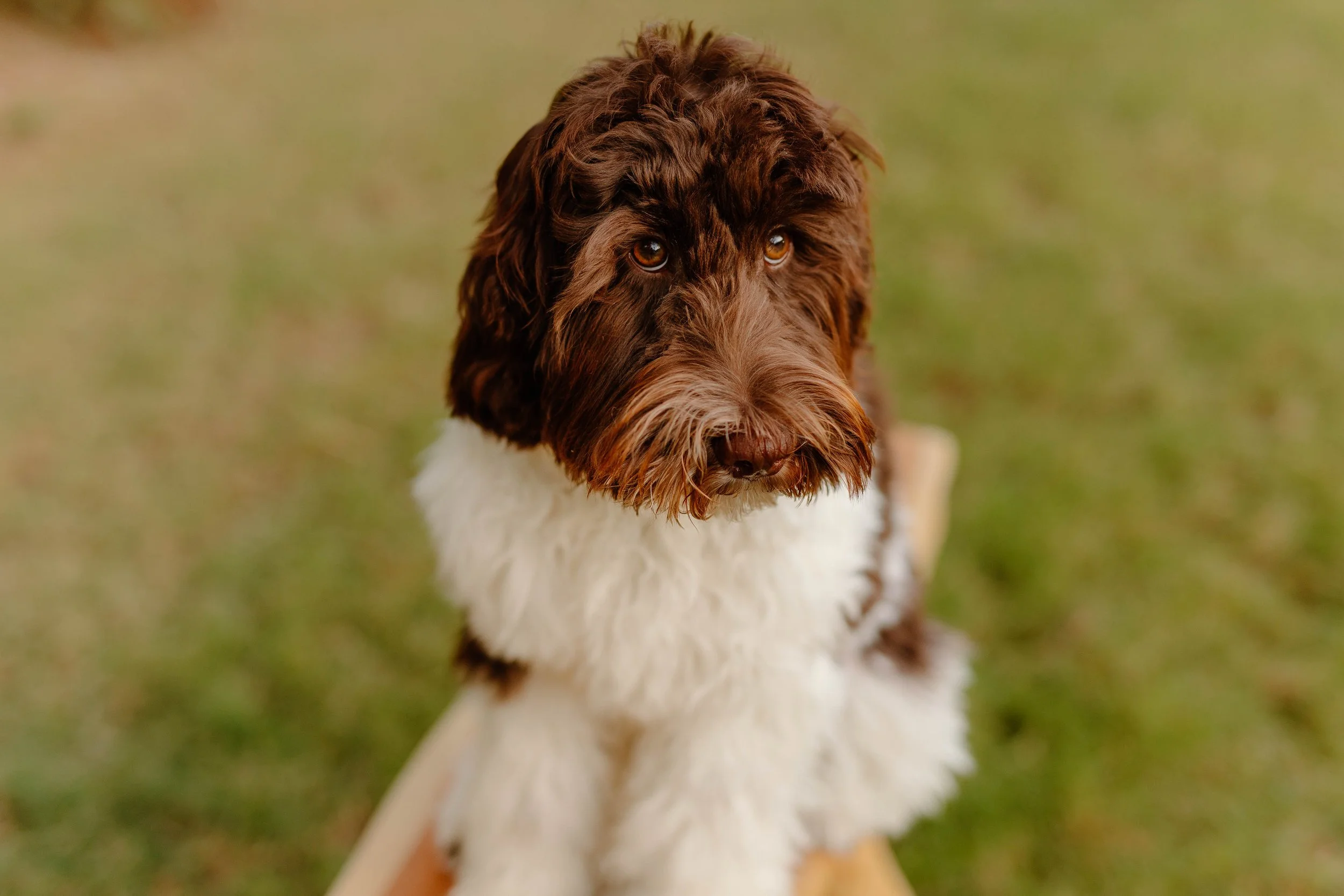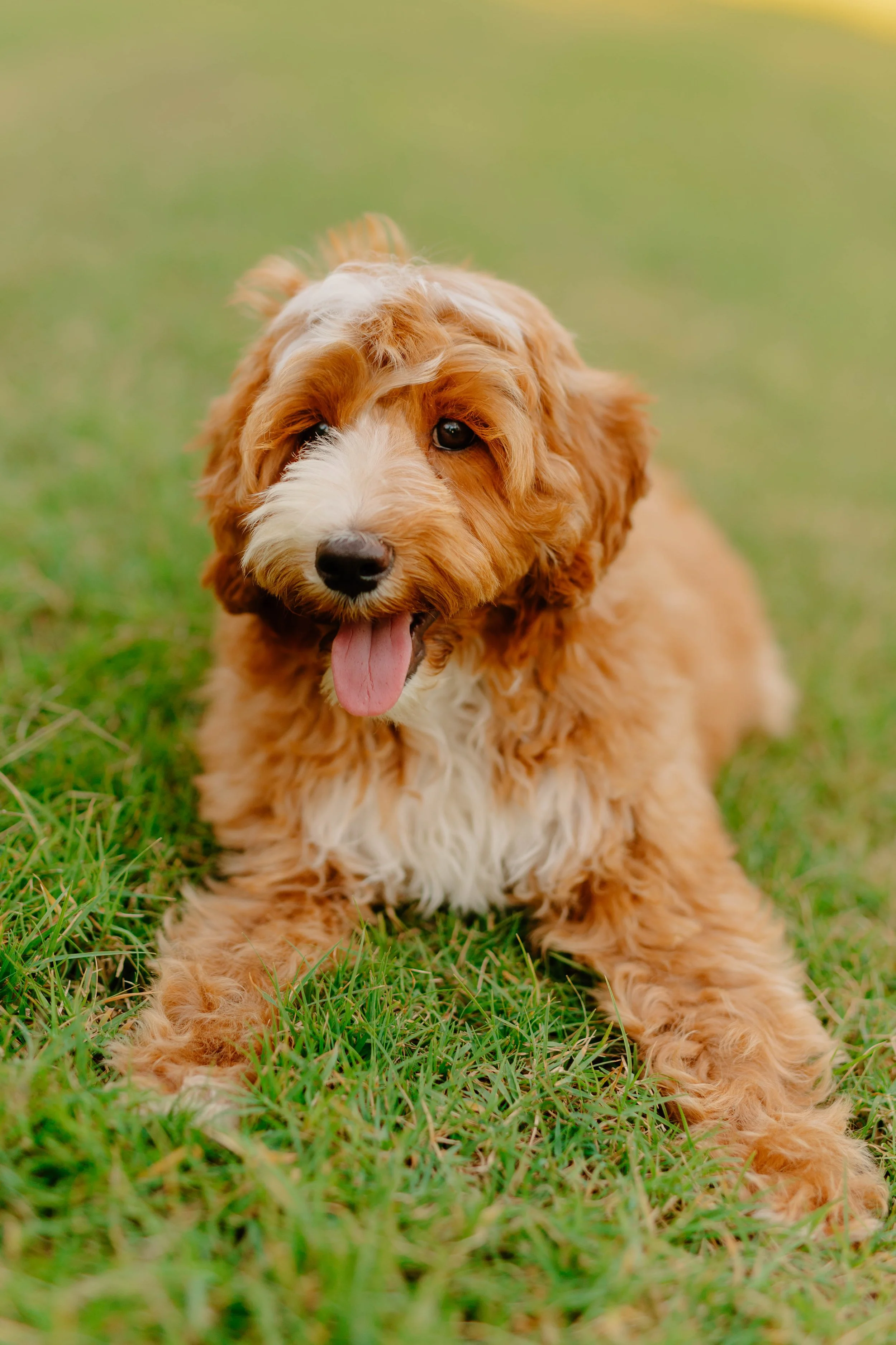 This is the coat that most people associate with a Labradoodle. The feel should be silky and soft. It can range from being almost straight, (straight/open fleece) or with just a few waves in it (wavy fleece). Regardless of the wave or curl this coat must be groomed in order to be mat free. Most often this coat is non-shedding, however, it is typical to find the occasional “dust bunny” around the house. This coat is frequently acceptable for people with allergies. The Fleece coat is what we breed for and produce at Mount Harmony Labradoodles.